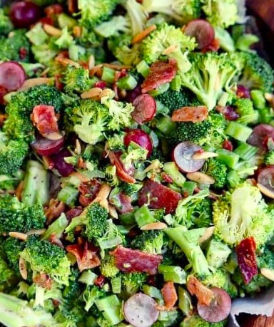 Combine broccoli, bacon, toasted almonds, green onions, celery and grapes in a large serving dish.
