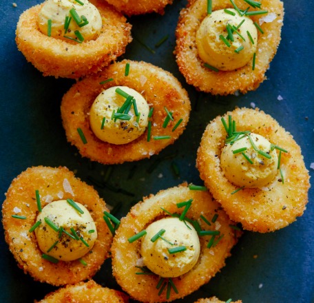 Deviled eggs fans will go crazy for these fried deviled eggs. You don't have to go to a fancy restaurant in Las Vegas to enjoy these beautiful little gems. These crunchy eggs will surely be a hit and everyone will be begging you for the recipe.