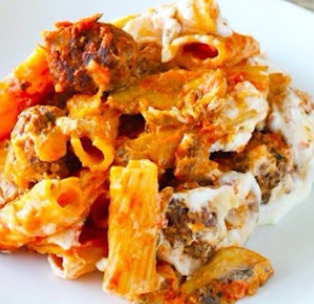 Serve your family a great pasta dish of meatballs, mushrooms, spaghetti sauce, mozzarella-cream cheese, and ziti or rigatoni. Serve it with a side salad and some garlic toast, if desired.