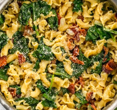 Add spinach to the skillet; stir until wilted into the pasta. Turn off heat; add bacon back to the skillet; sprinkle the Parmesan on top; stir to combine.