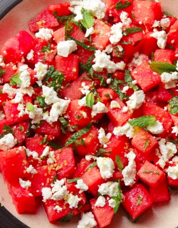 In a large serving bowl, combine watermelon, cucumber, red onion and mint. Pour dressing over the top; toss to combine.
