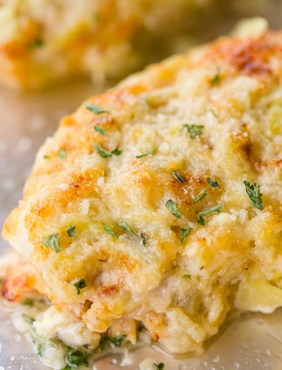 In a medium bowl, mix together the chopped artichoke hearts, cheese, mayonnaise and garlic powder; spread mixture evenly on the top of the chicken breasts.