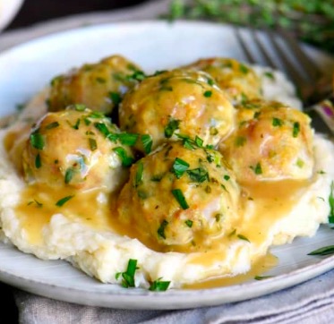 It doesn't have to be Thanksgiving to enjoy turkey, stuffing and gravy. Your family will ask for it over and over again. The baked seasoned meatballs are made with cornbread stuffing and are served with easy, deliciously seasoned store bought gravy. To ma