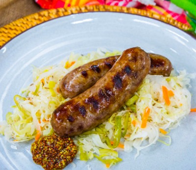 This is definitely not a quick recipe to prepare, but it is easy. It takes at least 3 days to make your own homemade sauerkraut from cabbage, carrots and leeks. When finished you grill the bratwursts and serve with whole grain mustard.