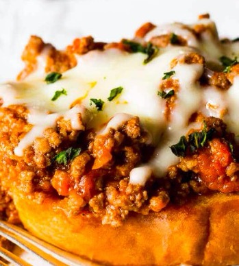 To serve, place a piece of garlic toast on a plate. Top with meat sauce, then cheese and basil if desired.