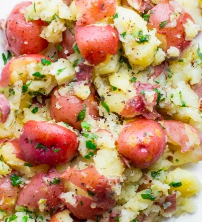 Return empty pot to the stove-top; add butter. Once melted, add garlic and white parts of the green onions. Sauté, stirring frequently, until garlic is fragrant, about 30-45 seconds. Remove from the heat. Add the green parts of the onions and parsley. Carefully add the cooked potatoes to the butter mixture; Using the back of a fork, gently press down on all potatoes until the skin breaks and potatoes smash just a bit. Gently stir potatoes and butter mixture together until combined. It's okay if some potatoes break down. Season with salt and pepper, to taste.