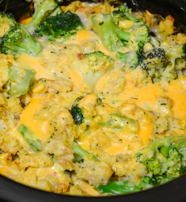 Mix together stuffing and stock/broth or water; microwave for 3 minutes. Pour into the slow cooker; add remaining ingredients; stir well. Cover; cook on Low for 2-3 hours until cheese melts and broccoli is tender.