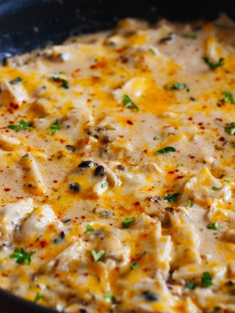 Make this inexpensive, simple, creamy, cheesy one pan meal in a little over 30 minutes for your hungry family. Change it up with Rotel tomatoes instead of green chilies, use flour tortillas, add a bit of cumin, or perhaps add corn and some sauteed bell pe