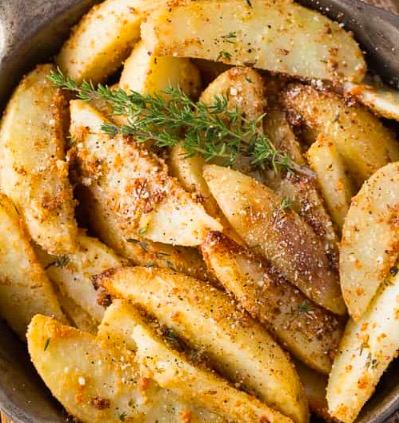 These delicious potatoes make a fantastic side dish to go along with just about any entree. They are crisply roasted in your oven with garlic, Parmesan cheese, olive oil, lemon juice and fresh thyme.