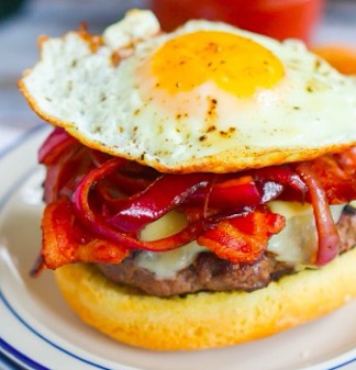 Serve your family or guests a truly juicy, decadent burger. It can be fried on the stovetop or made on the grill and then topped with sauteed onions, crispy fried bacon, gooey cheese and a runny fried egg.