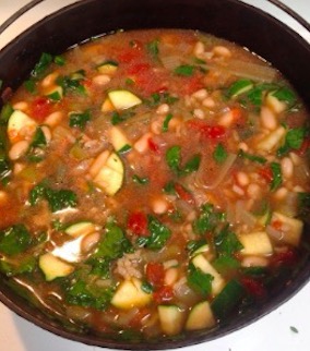 In a large pot, cook celery, onion and garlic in hot oil until tender. Add beef stock/broth, water and rice; bring to boiling; reduce heat; simmer, covered, for 15 minutes. Add torn spinach, beans, tomatoes, zucchini, thyme and pepper; cook and stir until heated through.