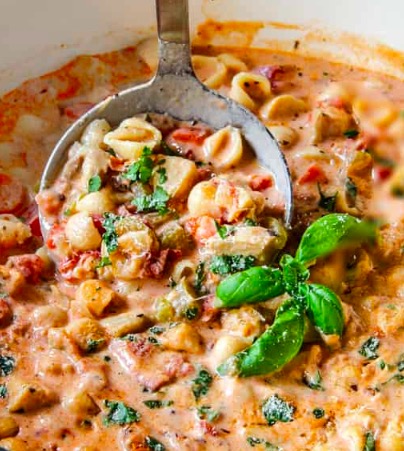 Stir in Parmesan cheese until smooth followed by heavy cream/half and half; stir in pasta. If wanting a less chunky soup, stir in additional stock/broth or cream/half and half. Remove and discard bay leaves.