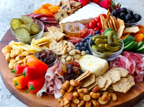 Using a cutting board, a serving tray, or even a small sheet pan as the board, arrange cheeses on the board; add the meats; add the crackers. Place little bowls of pickles and olives and small dishes of jam, mustard, and chutney on the board. Fill in gaps with lots of fresh vegetables, fruits, nuts, and other assorted snack foods.