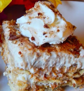 Spoon half of the cream cheese mixture over the pumpkin and pecans; spread out evenly. Layer on another layer of soaked cookies, followed by pumpkin, pecans and a final layer of the cream cheese mixture.