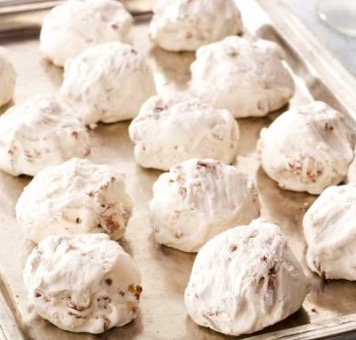 Quickly drop by heaping teaspoonfuls onto the prepared pans; let stand at room temperature until dry to the touch. Store between sheets of waxed paper in an airtight container at room temperature.