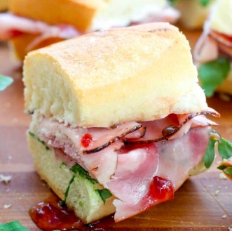 Slice bread horizontally in half lengthwise, forming 2 flat halves. Spread goat cheese onto each section of bread; layer arugula on the bottom half; arrange folded/rolled ham evenly over the greens, forming piles of ham across the bread to create the best texture. Spoon jam over the goat cheese on the top half of the bread. Close; slice into 4- sections.