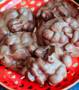Layer all ingredients in a large crockpot, starting with the peanuts. Turn crockpot on Low; cover; let sit for 2 hours.