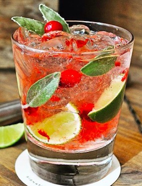 In a cocktail shaker, place the two fresh sage leaves; muddle. Fill halfway with ice cubes, add gin, white cranberry juice and lime juice. Shake.