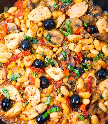 Add 1 T. olive oil to the skillet; toss the diced tomatoes, sun-dried tomatoes, cannelini beans and black olives. Season with salt and freshly ground black pepper; sprinkle in oregano and thyme; drizzle on the balsamic vinegar and honey; stir a few minutes.