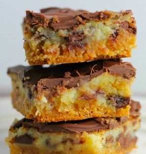 Remove from oven. Scatter the semi-sweet and milk chocolate chips on top of the bars; let sit several minutes to allow them to soften and melt a bit. Use a knife to spread the chocolate around, covering the entire pan.