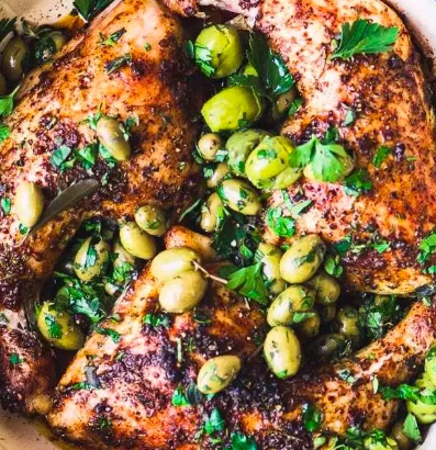Serve chicken topped with the olive mixture and fresh parsley scattered on top.