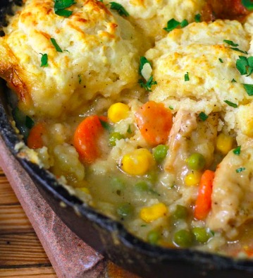 Drop biscuits by the rounded tablespoon full on top of the pot pie. Place skillet on a cookie sheet; place into the oven.