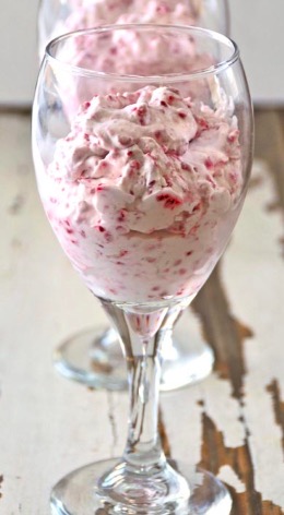 In a food processor, blend together the frozen raspberries and sugar. Once the raspberries have been blended, fold them in to the whipping cream.