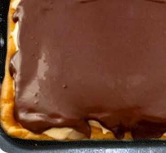 Pour ganache over the cream filling, spreading to cover the entire surface. Return the pan to the refrigerator. Chill for at least 1 hour before serving.