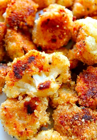 Break cauliflower into large florets; cut very large florets into 3/5" thick slices, and the medium florets in halves. There should be a large flat surface area on each piece for the crust to adhere to.