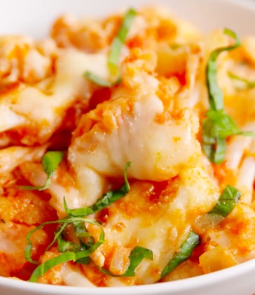 In a large baking/casserole dish, add blanched cauliflower. Pour on vodka sauce and half of the mozzarella and Parmesan cheeses; stir to combine. Top with remaining Mozzarella and Parmesan cheeses.
