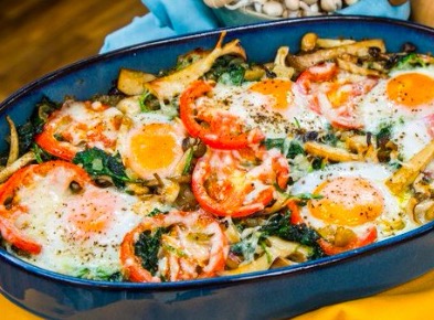 If the mushroom mixture was chilled overnight, warm it in the oven for 15 minutes before proceeding. Then arrange the tomatoes over the mushroom mixture; sprinkle cheese over the vegetables. Carefully crack the eggs on top of the mixture, keeping the yolks intact; season with salt and pepper, to taste.