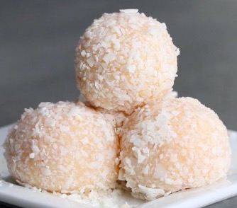 Gently dredge in the coconut flakes until totally covered. Place into paper bonbon cups.