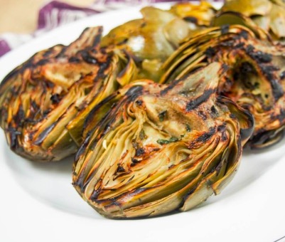 Place artichokes cut side down on a hot grill; cook until dark grill marks have formed; flip; cook briefly.