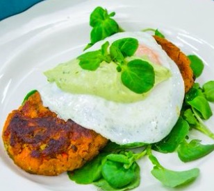 Salmon Croquettes with Over Easy Eggs and Avocado Dressing