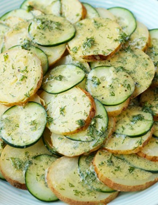 Stir cucumbers into the yogurt mixture. Add in cooled potatoes; fold until coated.
