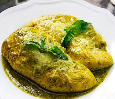 In a small bowl, whisk together pesto and 1/2 c. water; pour over chicken.