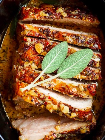 In the meantime, cut pork loin into slices; place back into the crock pot to reheat for several minutes. When warmed, place slices back onto the platter;