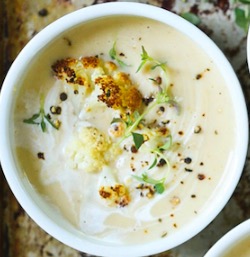 Roast in oven until cauliflower and garlic are both tender and golden brown, about 30-35 minutes. Let cool before squeezing cloves from skin.