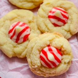 What better way to celebrate the season with these beautiful, festive cookies. They have triple white chocolate from the white chocolate candy, white chocolate pudding and candy cane Hershey's white chocolate kisses on top.