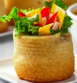 Slice domed tops off each piece of bread. Use fingers to remove the middle of the bread; use fingers to push bread to the edges to end up with a hollow cavity. The extra bread can be used later to dip in the warmed soup from the soup cans.
