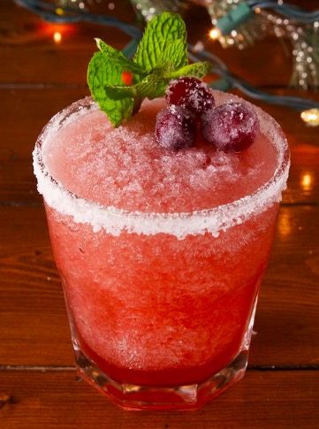 This drink will be a hit at a Christmas party. It could be served on the rocks, just omit the blender step and pour it into a large beverage dispenser. Rimming the glasses with sugar/salt and garnishing with mint and cranberries make it very festive.