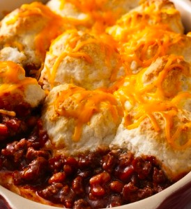 Meanwhile, in a medium bowl, stir in Bisquick, milk and butter until soft dough forms. Drop dough by 12 spoonfuls into beef mixture.
