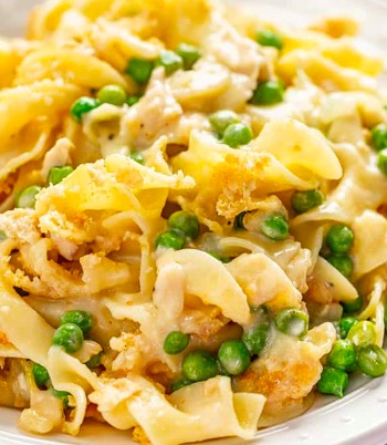 Your family will love this creamy chicken dish that's prepared with a made from scratch sauce, peas or broccoli, cooked chicken, cheese and is topped with a buttery cracker topping that puts it over the top.