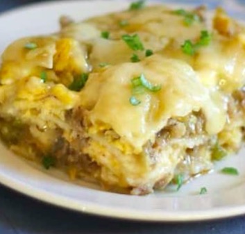 This is a wonderful, savory dish whether you serve it for breakfast or breakfast for dinner. It's made with layers of scrambled eggs, breakfast sausage, bell peppers, onion and cheese in a yummy enchilada sauce. It's the perfect company breakfast.