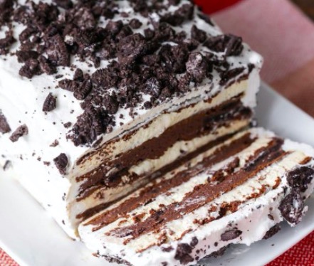 Add the remaining 4 ice cream sandwiches; cover cake with the remaining whipped cream. Be sure to add the remaining chopped cookies to the cake, adding them to the top or all over the cake.