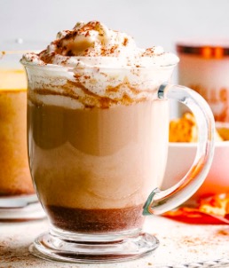Pour the hot espresso/coffee into large mugs; add foamed milk; top with whipped cream and a sprinkle of pumpkin pie spice.