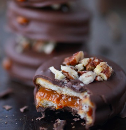 Melt chocolate almond bark in a microwave safe bowl in the microwave. Dip the caramel sandwich cookies in the chocolate almond bark, placing them on a silicone mat or a piece of parchment paper. Sprinkle with chopped pecans or place a whole pecan on the tops of each cookie. Sprinkle each cookie with sea salt.