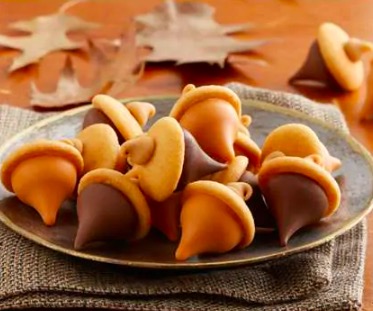 Place a small dab of icing on bottoms of peanut butter or butterscotch chips; immediately attach to tops of cookies to finish acorn.