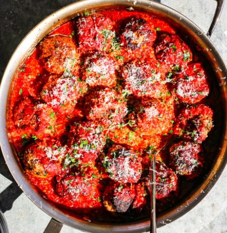 Remove pan from heat; wipe the skillet clean to remove all browned bits. Place meatballs in a single layer in the skillet. Evenly pour marinara over the top.
