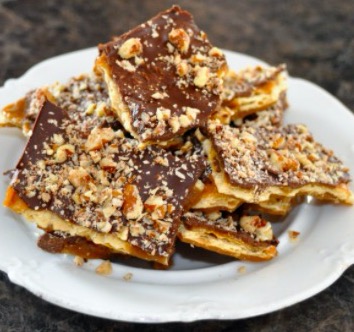 Sprinkle chocolate chips over the top; let sit for 5 minutes. Spread melted chocolate. Sprinkle on chopped nuts. Let cool completely. Break into pieces.